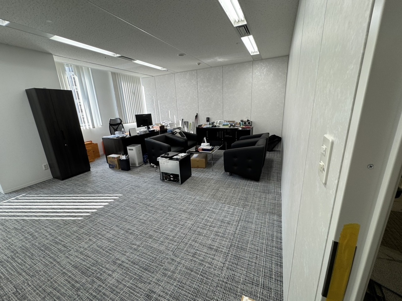 今回は壁へのシートの施工、タイルカーペットの貼り替え、既存間仕切や天井へのグラスウール(断熱や吸音の役割を持つ素材)の充填などを行いました。