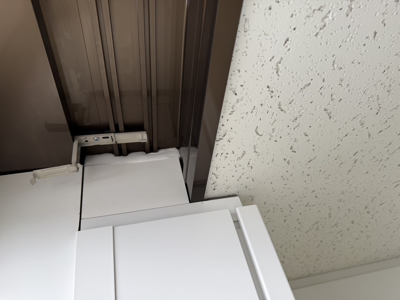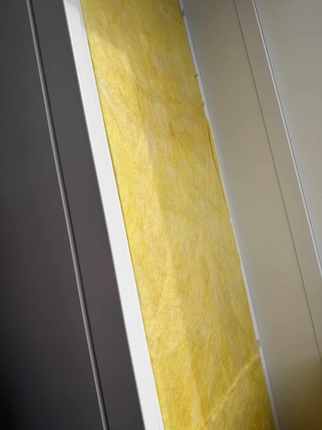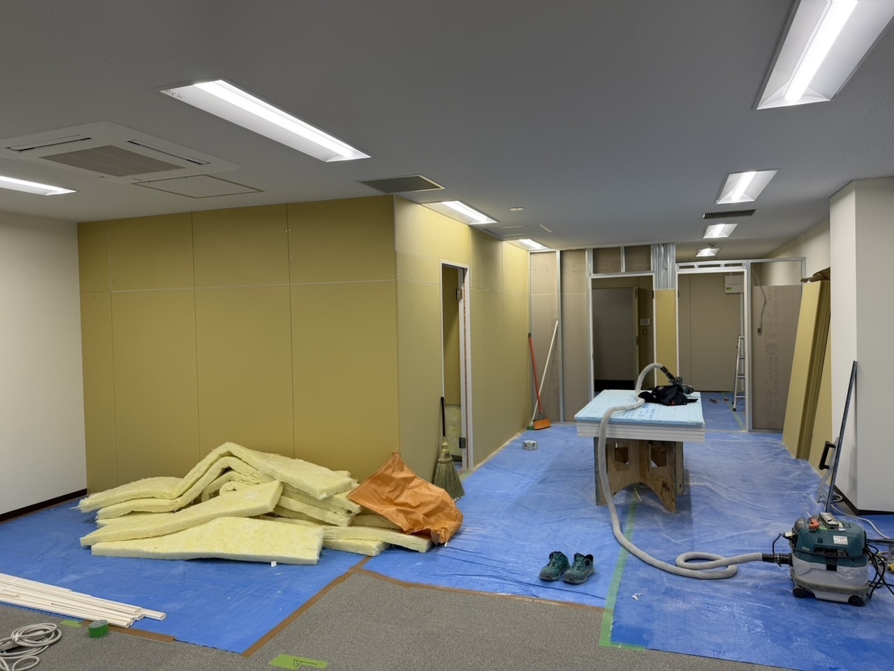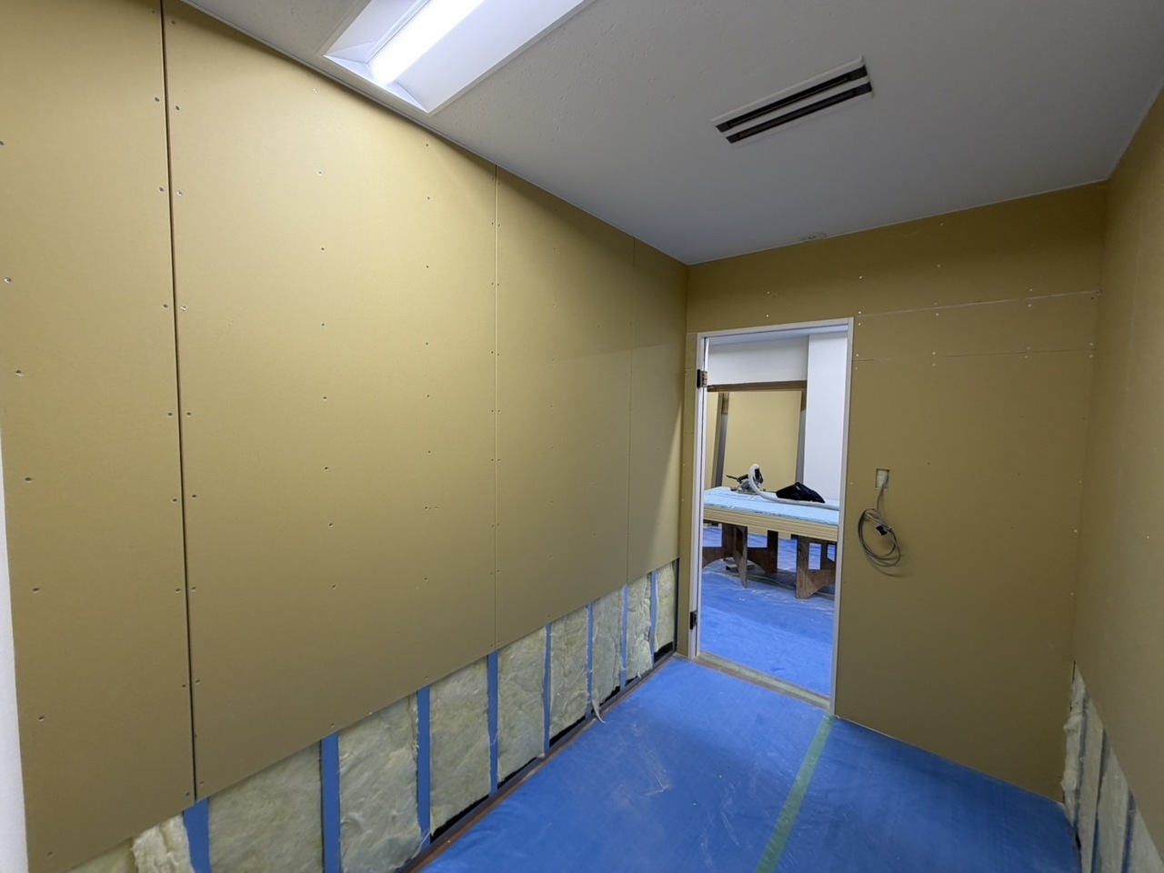 今回は既存のパーティションと天井裏にグラスウールを充填しました。