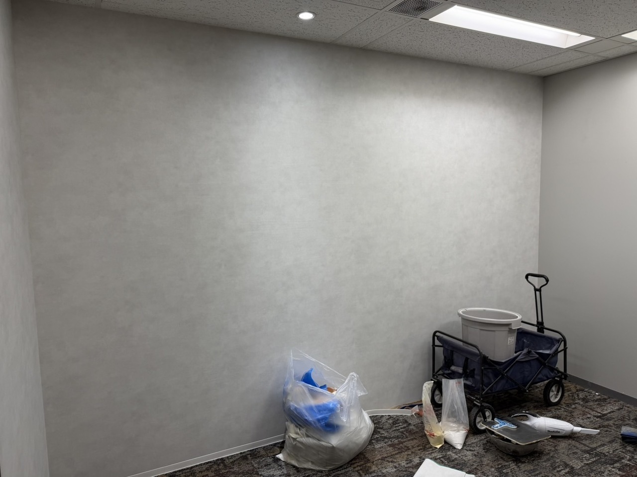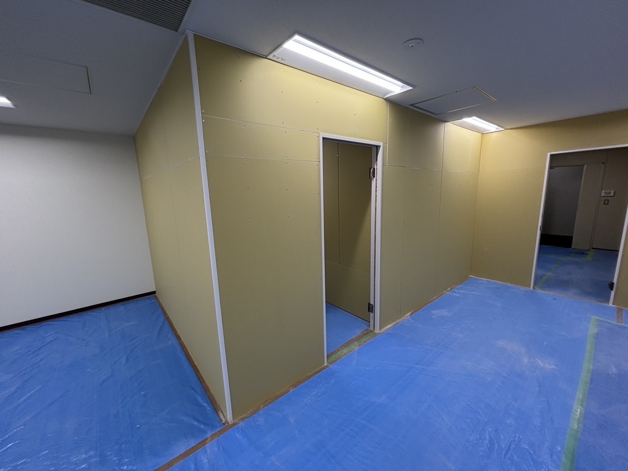 写真のようにプラスターボード(石膏ボード)まで施工した後は表装の仕上げに入ります。今回はクロスで仕上げます。