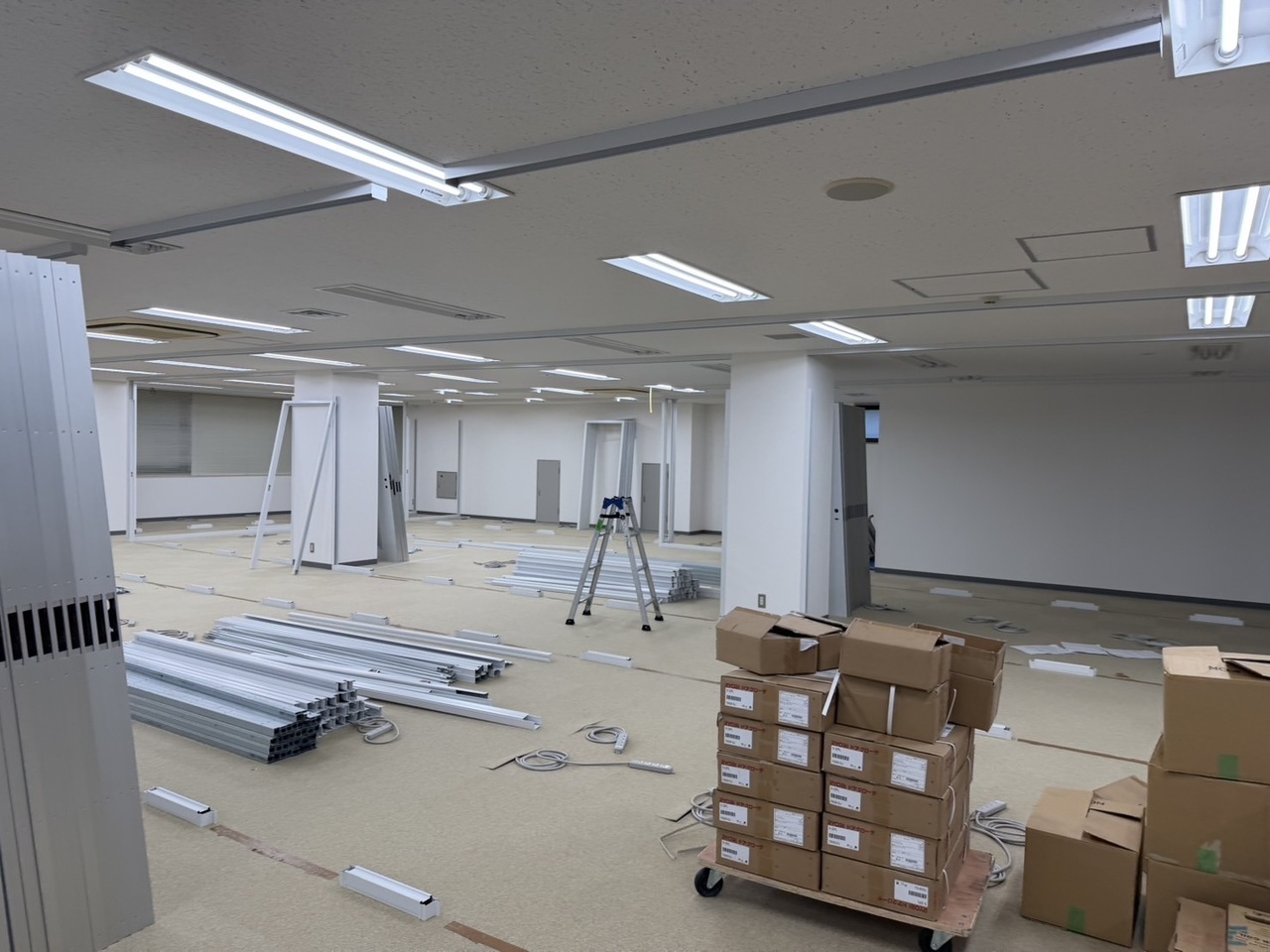 解体工事に始まり、間仕切(今回はLGS)や内装工事へ続いていきます。